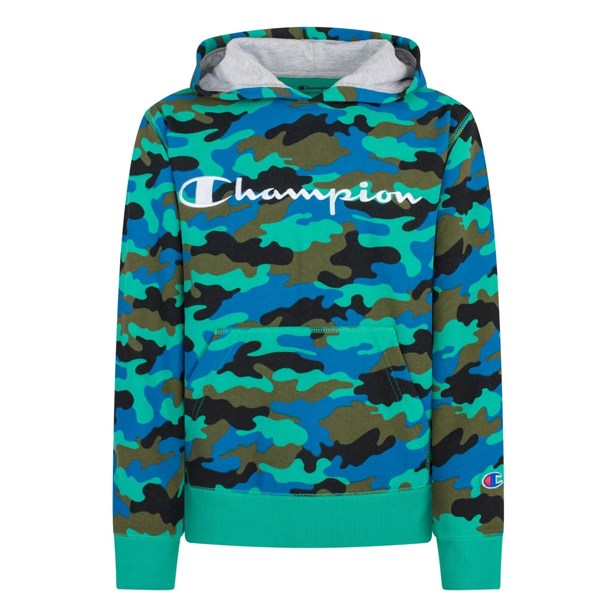 Iconic Champion style starts with this AOP camo hoodie! Featuring an AOP camo design, jersey lined hoodie, pouch pocket and embroidered “C” patch.