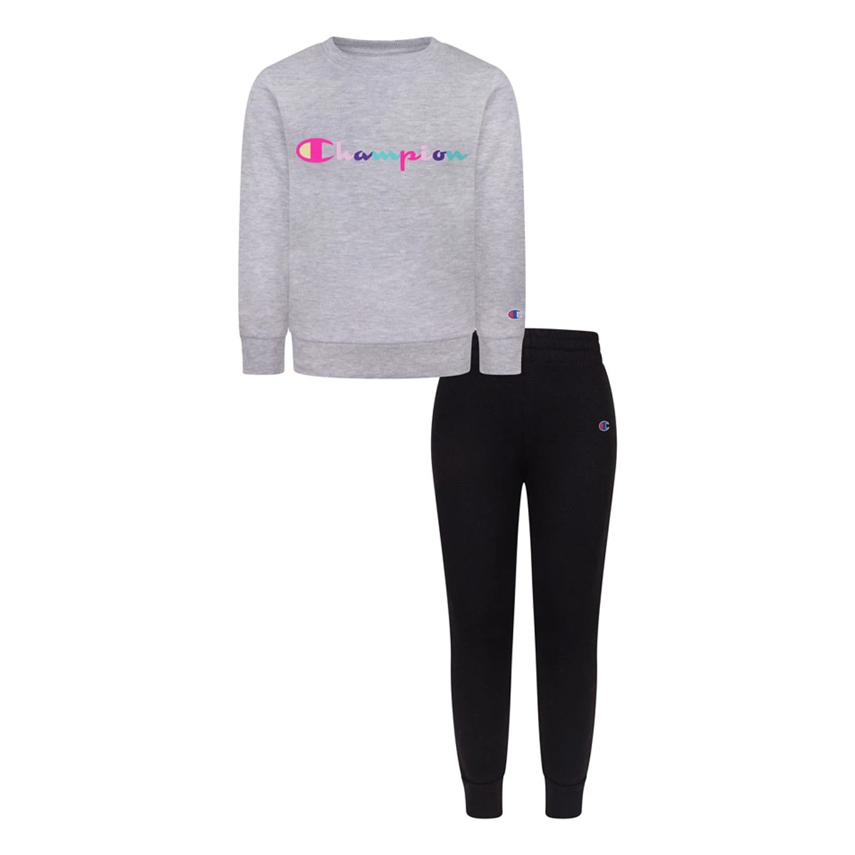 Your little Champion will love this cute 2pc Set! Featuring a fun colorblock script on the fleece crew and comfy leggings.