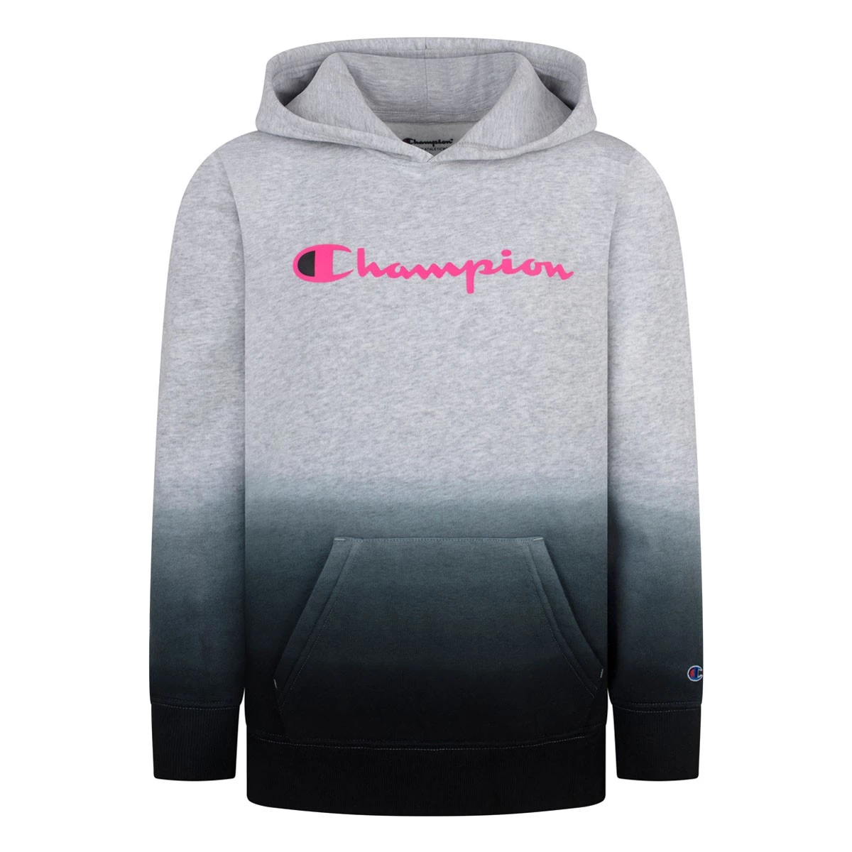 Your little Champion will be the coolest kid on the block! Featuring a dip dye fabric, Champion script screen print, pouch pocket and embroidered “C” patch.
