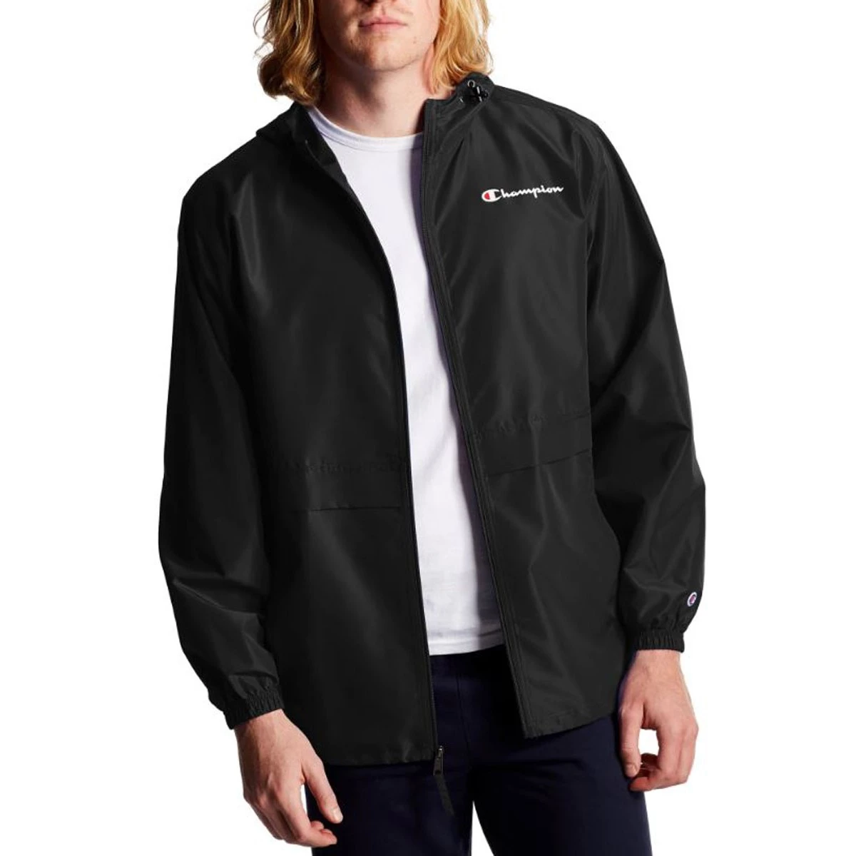 Lightweight water- and wind-resistant jacket goes from fair to stormy weather wherever adventure takes you. Full zip front gets you into jacket as soon as the first drops fall. Low profile side pockets keep essentials handy. The hood and hem have adjustable shock cords to keep out the elements. Champion logo on the chest adds winning style.