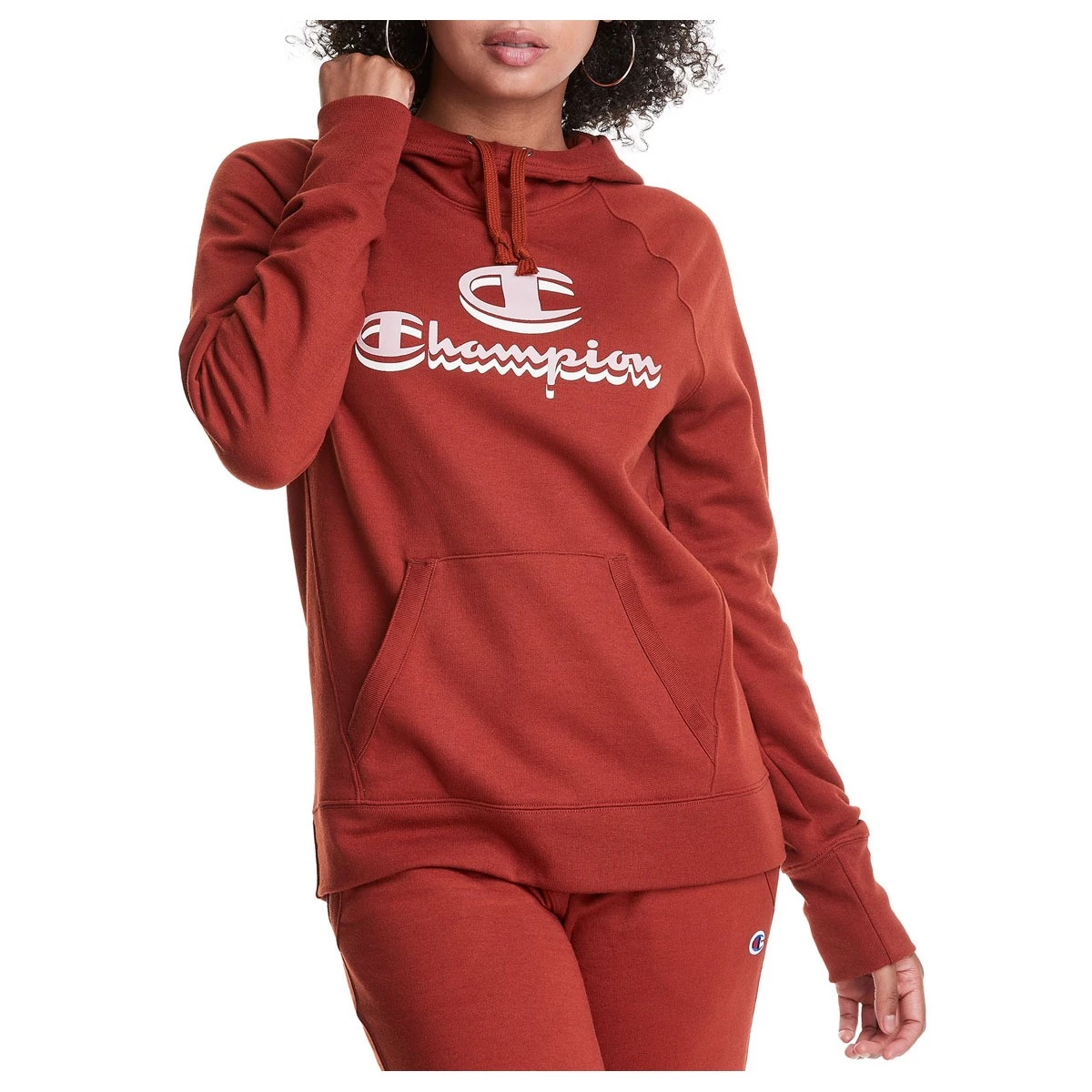 So comfy it???ll become a regular player in your hoodie rotation, our midweight Powerblend?? Hoodie is perfect whether you???re chilling out or heading out. Brushed inside for warmth, without the extra weight, this cotton-polyester blend fleece resists shrinking and pilling. Jersey-lined scuba hood, rib-trimmed kanga pocket, and exaggerated ribbed cuffs and narrower bottom band give it a modern, yet feminine fit. Drop shadow C + Champion script logo make it a style stand out.